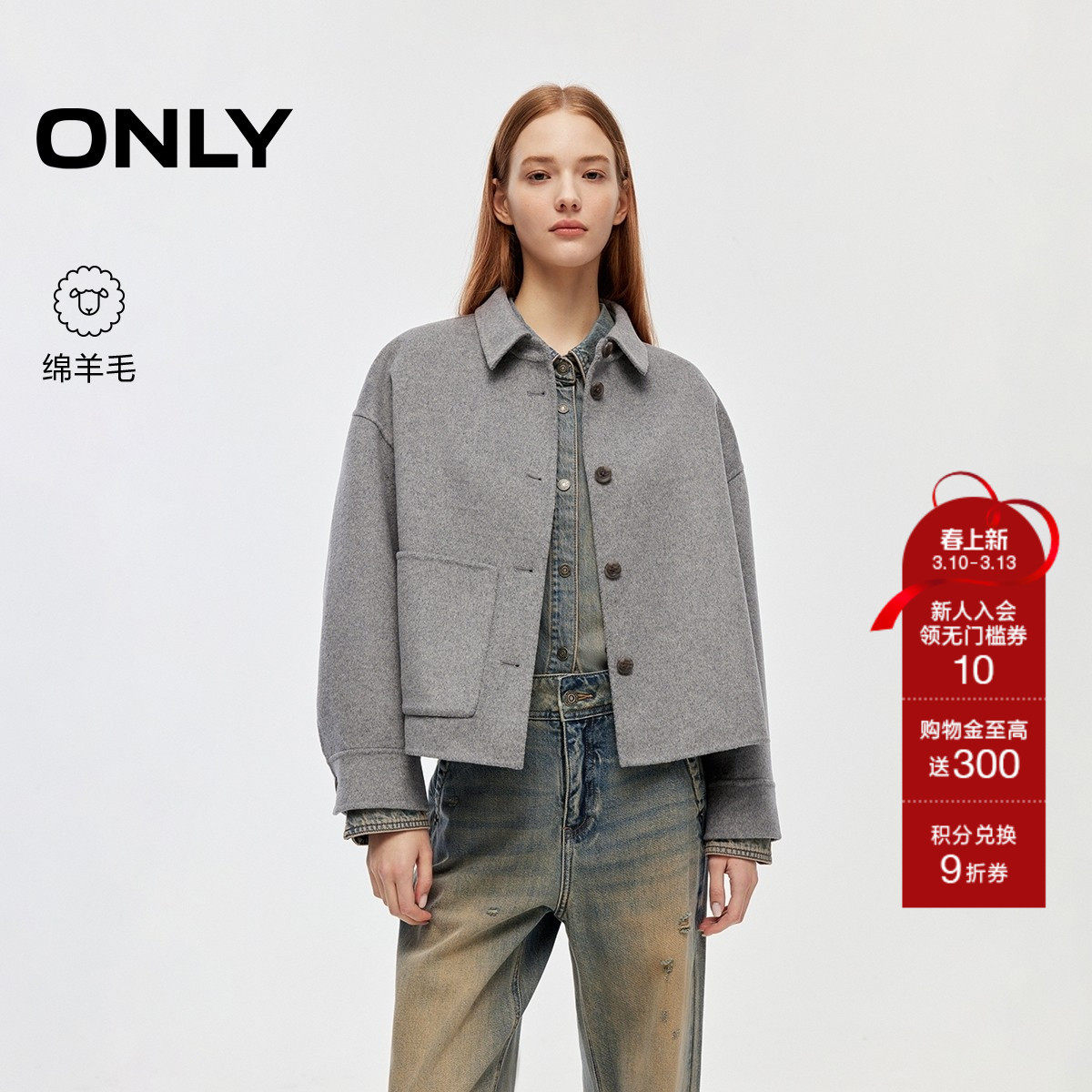ONLY2025冬季新款大口袋宽松舒适落肩短款衬衫双面毛呢大衣外套女