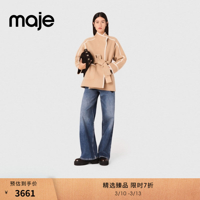 季末7折Maje2025秋冬款女装法式羊毛混纺系带短款双面毛呢大衣