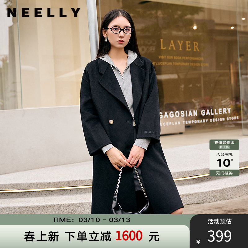 NEELLY纳俪商场同款冬季新款廓形绵羊毛双面毛呢大衣黑色外套女