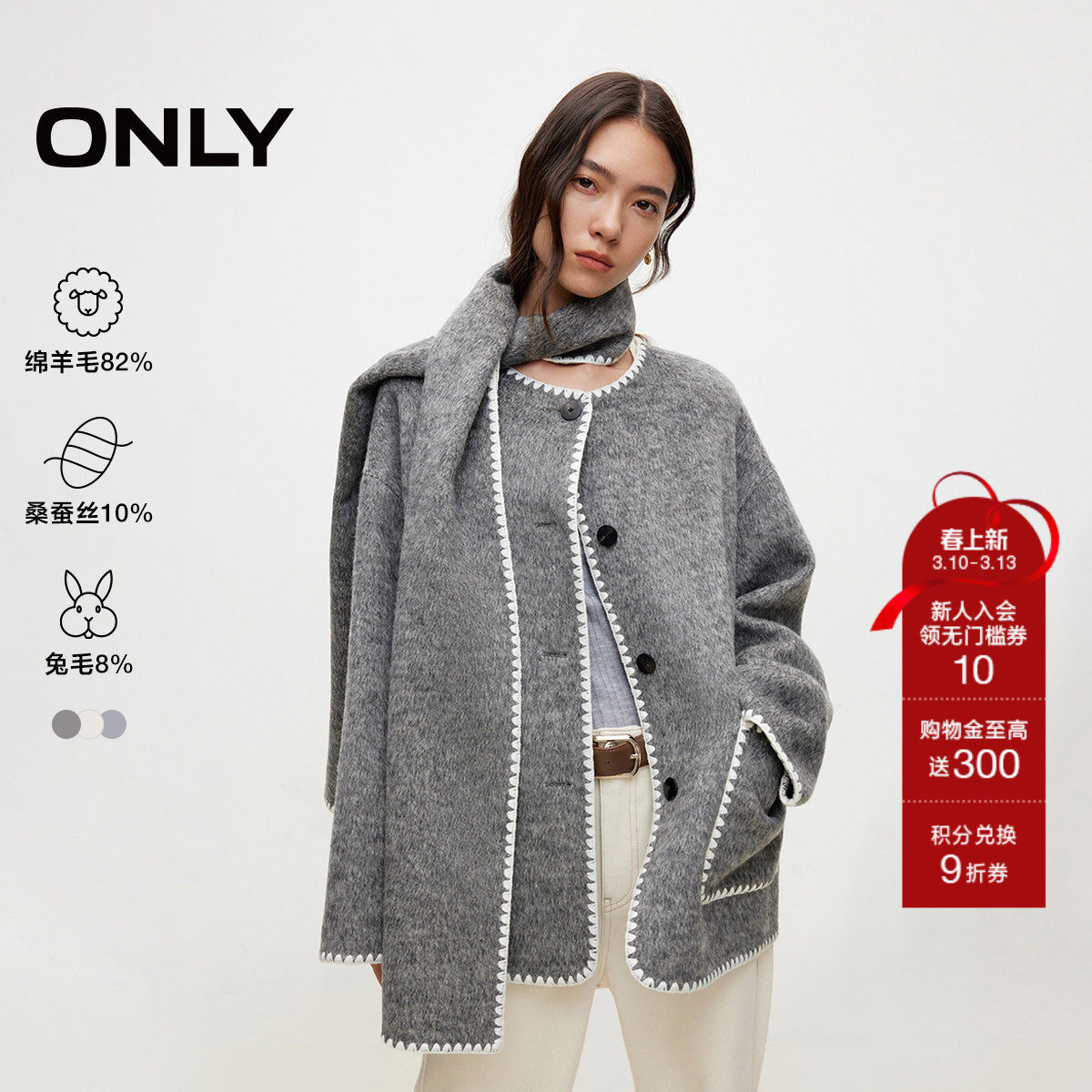 ONLY2025冬季新款撞色贝壳绣边围巾绵羊毛桑蚕丝双面毛呢大衣外套