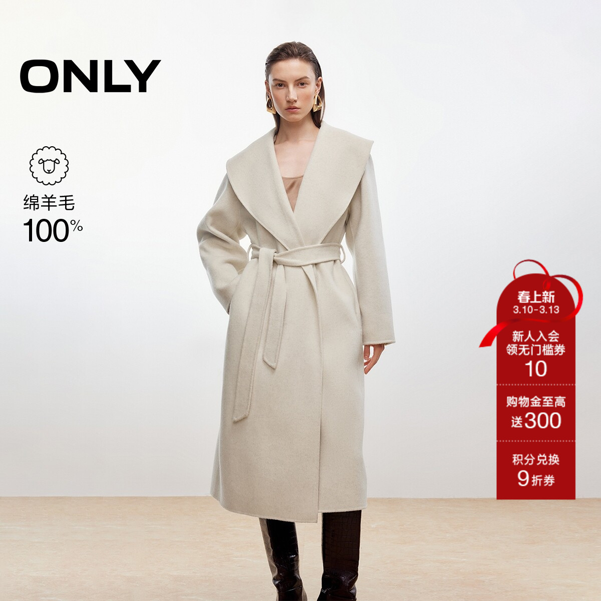 ONLY2025冬季新款100%绵羊毛纯色睡袍式系带长款双面毛呢大衣外套