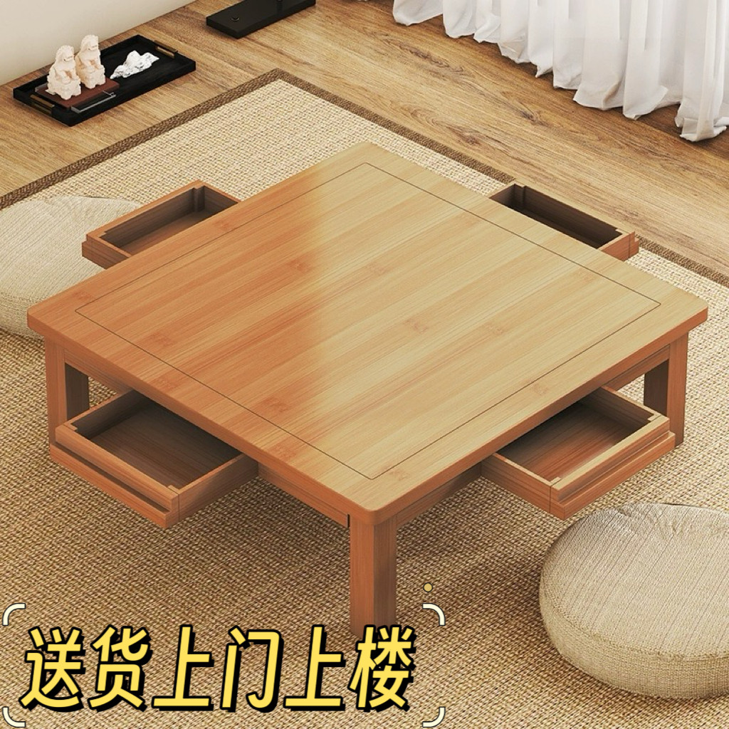 榻榻米茶桌炕桌吃饭农村茶几飘窗矮桌实木学习桌楠竹带抽屉正方形