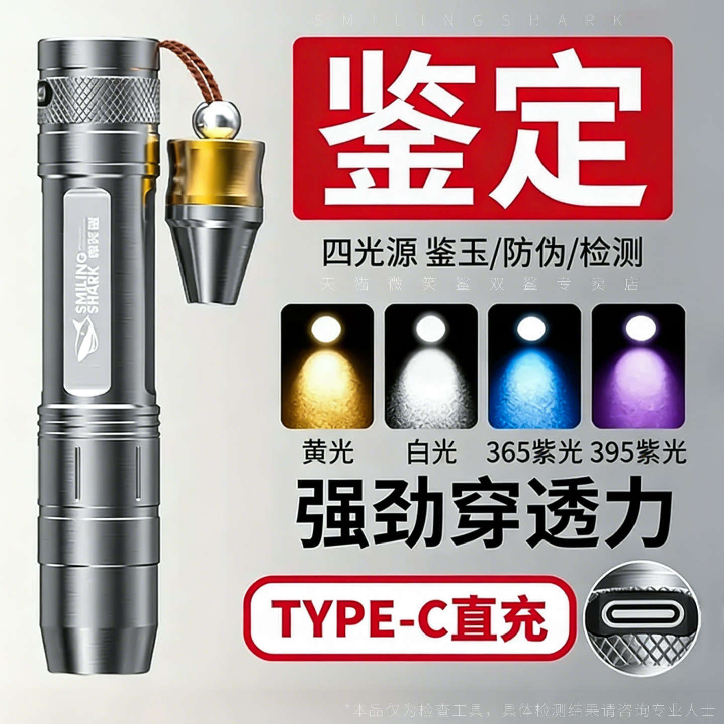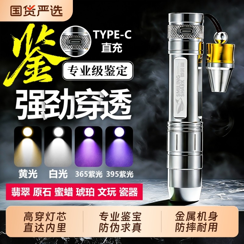 微笑鲨玉石鉴定专用强光手电筒365nm紫光灯文玩翡翠原石珠宝烟酒