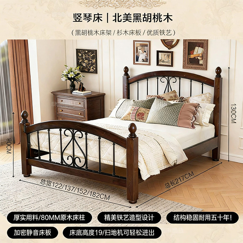 北美黑胡桃木实木床美式铁木床双人床1.5m1.8m纯原木结婚床主卧床