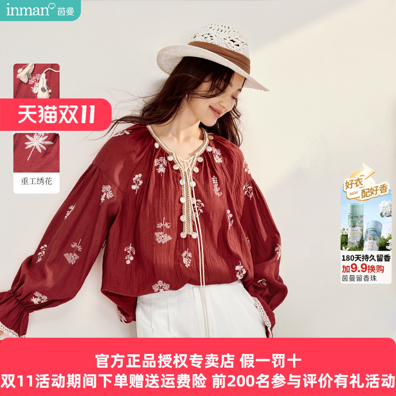 茵曼波西米亚刺绣贝壳织带衬衫2026春季女装新款红色灯笼袖衬衣