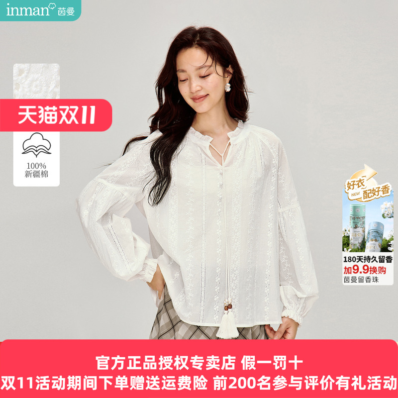 茵曼100棉刺绣木耳边流苏衬衫2026春季女装新款白色灯笼袖衬衣