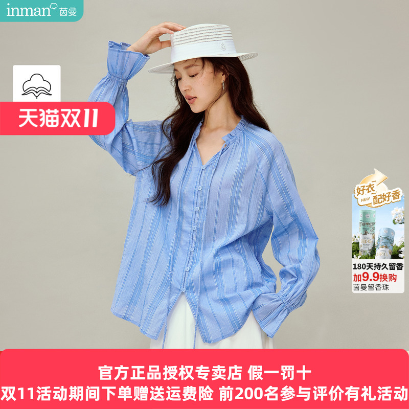 茵曼蓝色条纹系带荷叶边立领衬衫2026春季女装新款喇叭袖宽松衬衣