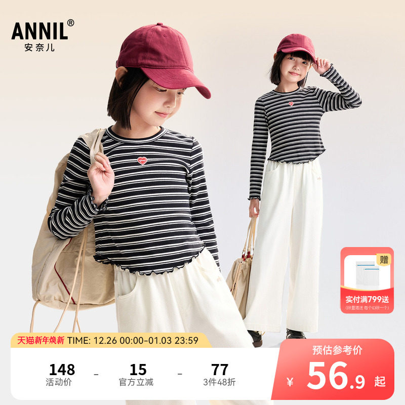 【短款条纹T】安奈儿童装女童圆领长袖T恤025秋季新款休闲打底衫