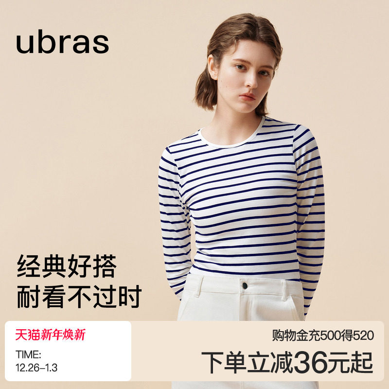 ubras纯棉长袖t恤黑白色修身上衣女2025秋季新款条纹修身打底衫