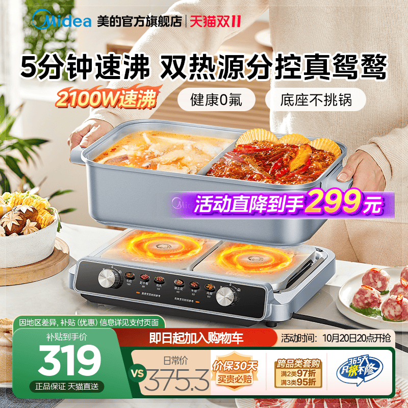 美的超薄速沸电火锅家用锅分体式分控鸳鸯锅多功能锅大容量电煮锅