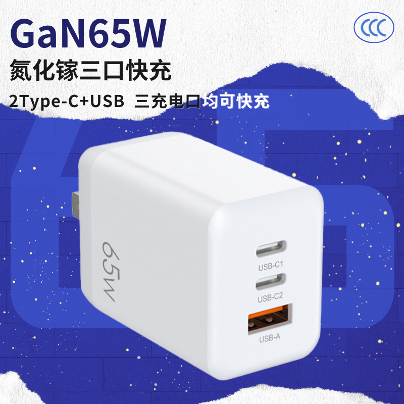 65W氮化镓三口充电头超级快充3C认证小巧迷你双Type-C手机充电器可收缩USB适用于苹果联想笔记本电脑充电器