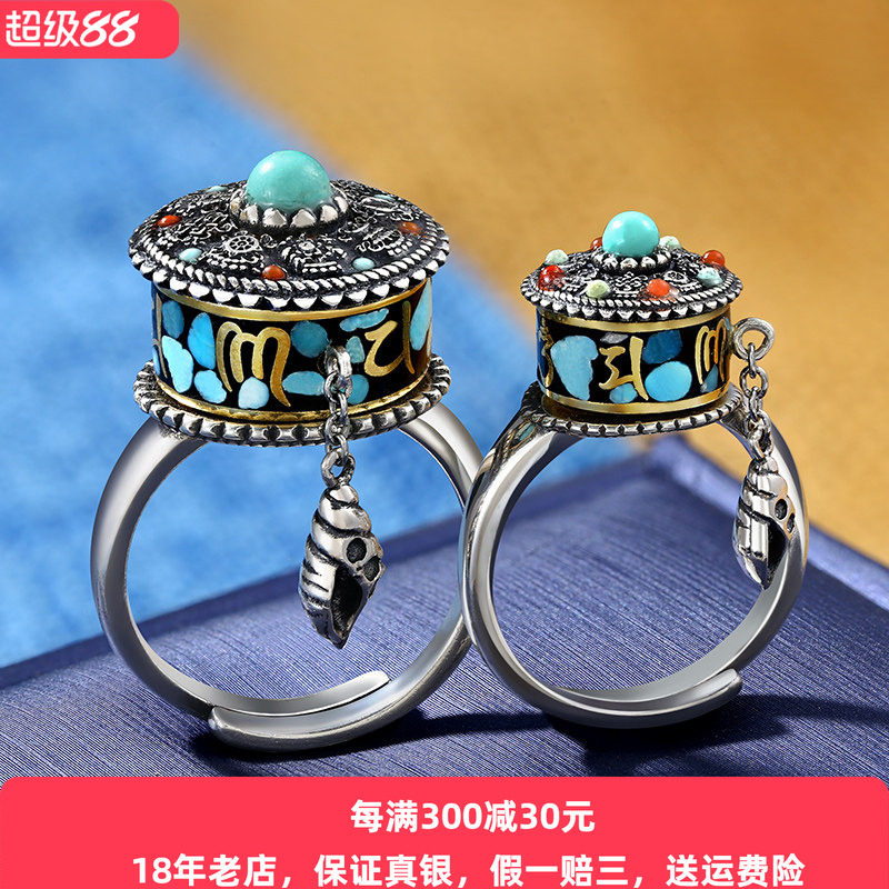 六字真言戒指男潮纯银个性霸气情侣转动复古女泰银男士食指送男友