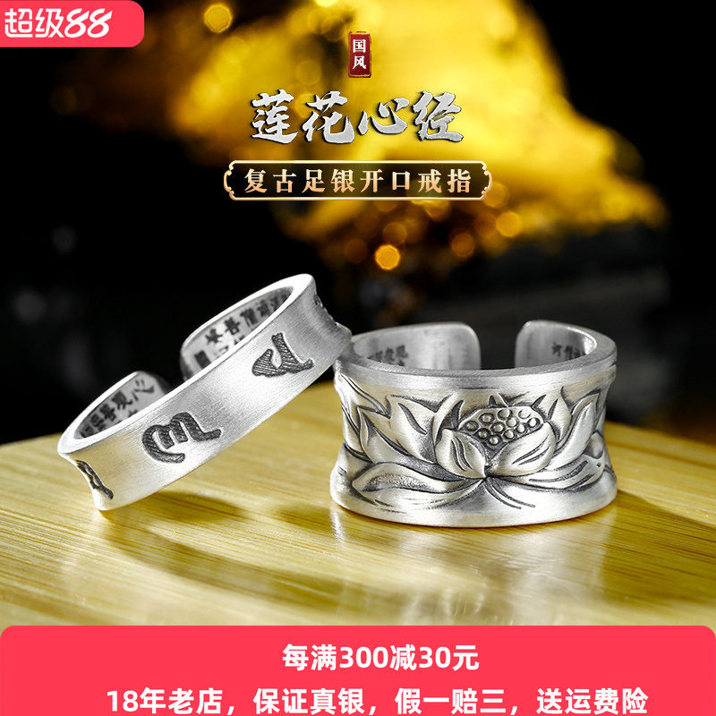足银999宽面莲花心经戒指纯银男士复古六字真言食指女开口可调节