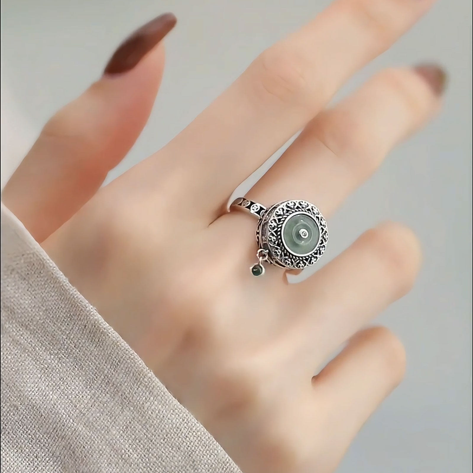 925银复古新中式莲花蓝水翡翠平安扣转动戒指环六字真言开口调节