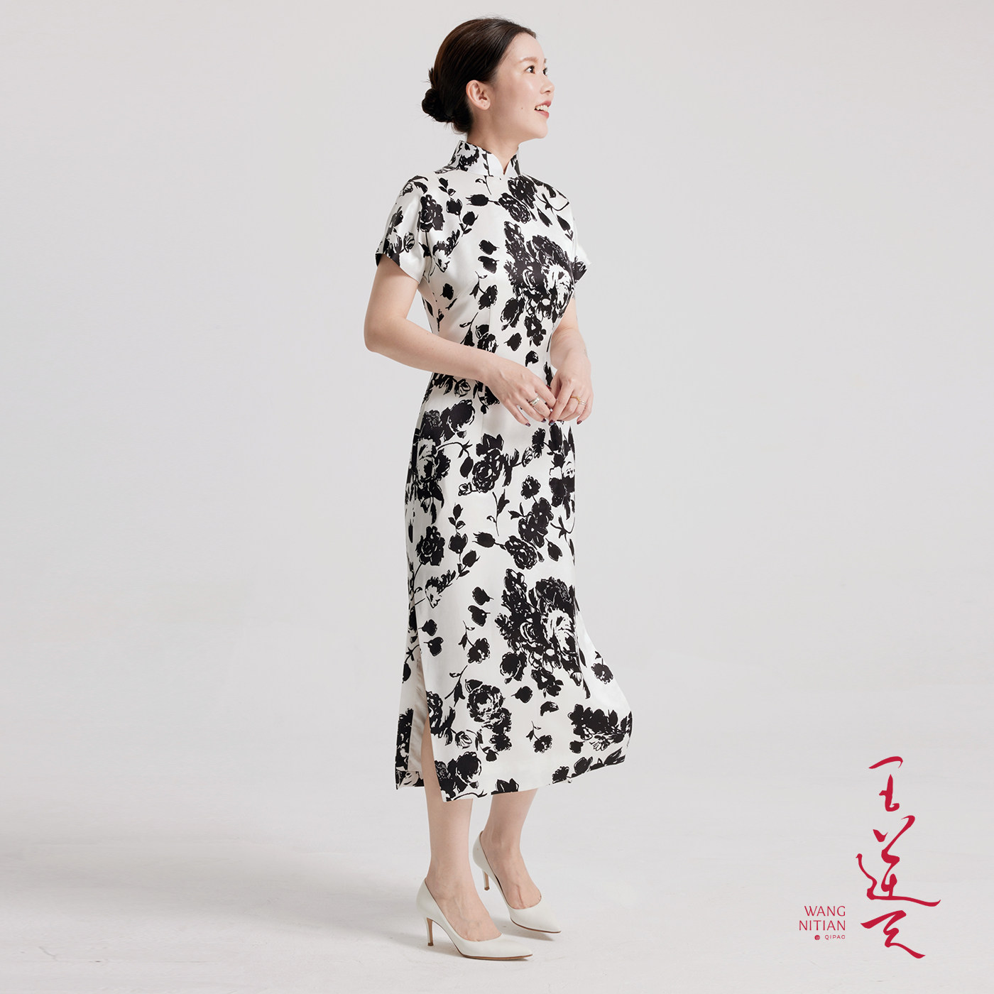 无有无印真丝桑蚕丝凉爽透气优雅印花长款无袖包肩旗袍M23167