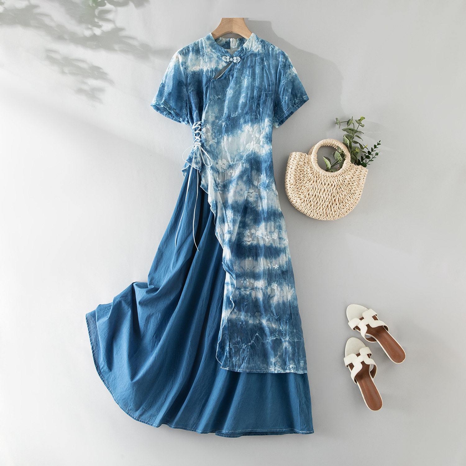 云南植物扎染新中式国风旗袍优雅不规则新连衣裙假两件套刺绣长裙