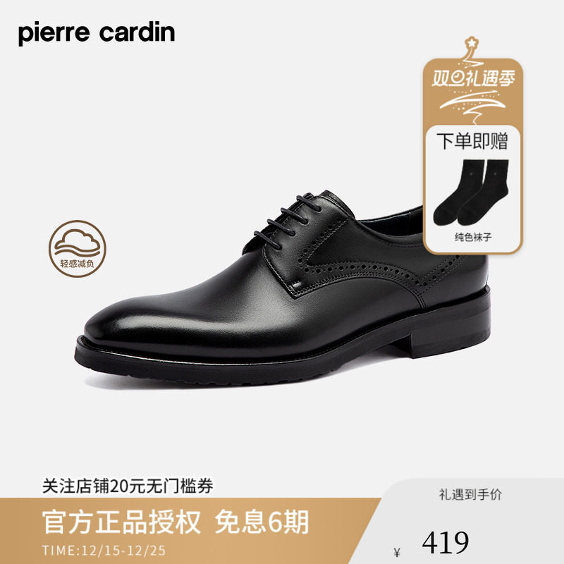 皮尔卡丹男鞋商务正装皮鞋真皮系带雕花防滑耐磨超轻透气德比鞋男