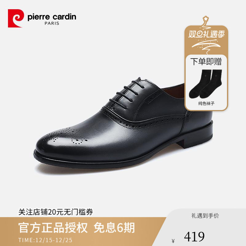 皮尔卡丹男鞋商务正装冲孔透气舒适布洛克雕花系带平跟真皮皮鞋男