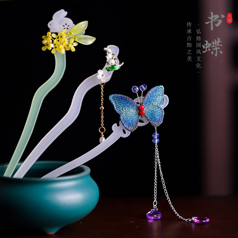 汉服搭配发饰简约气质铃兰花蝴蝶发簪古典环形设计感簪子盘发头饰