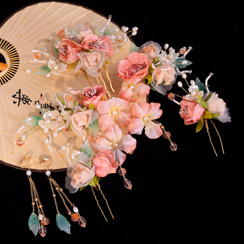 古风头饰汉服粉色绢花发饰套装流苏发夹复古花朵簪子古典旗袍配饰