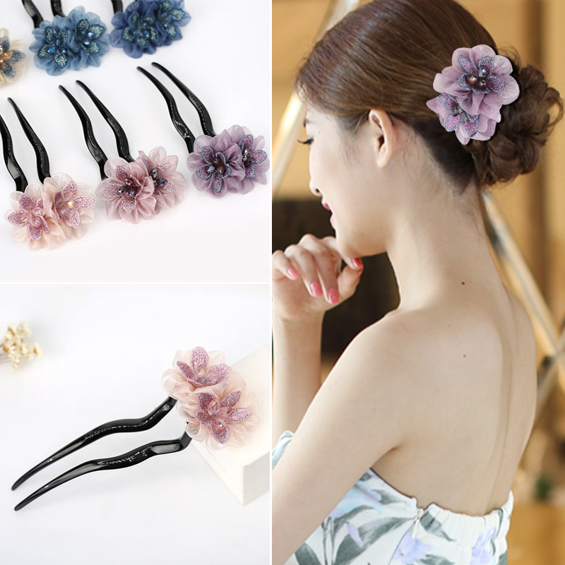 刺绣花朵簪子古典宫廷盘发卡子发饰U型发簪成人发钗二齿发梳发饰