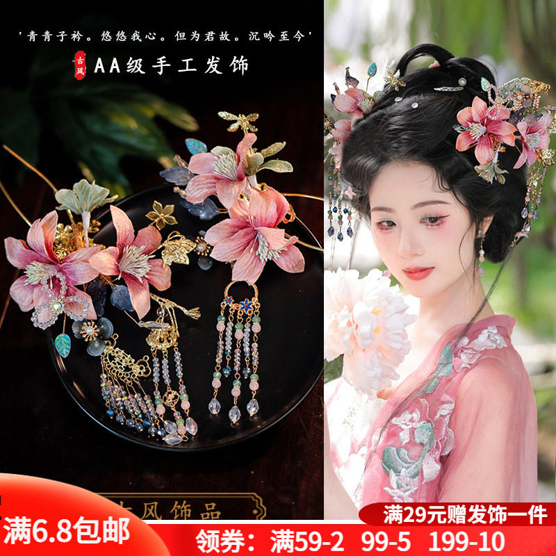 宫廷风簪花汉服头饰绢花发饰套装花朵发钗流苏发簪子古典唐风头饰