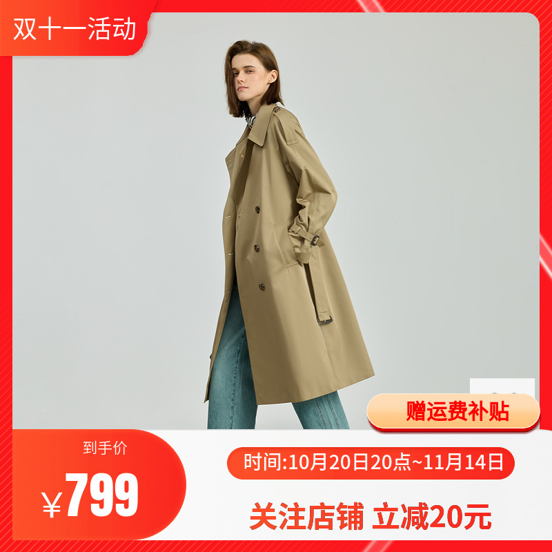 【商场同款】LILY秋新款女装复古双排扣垂坠感长款风衣外套女