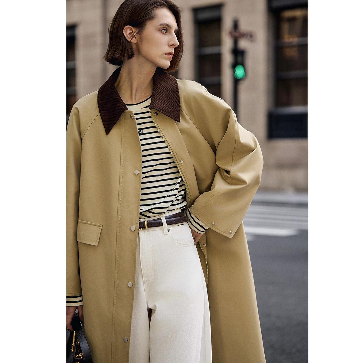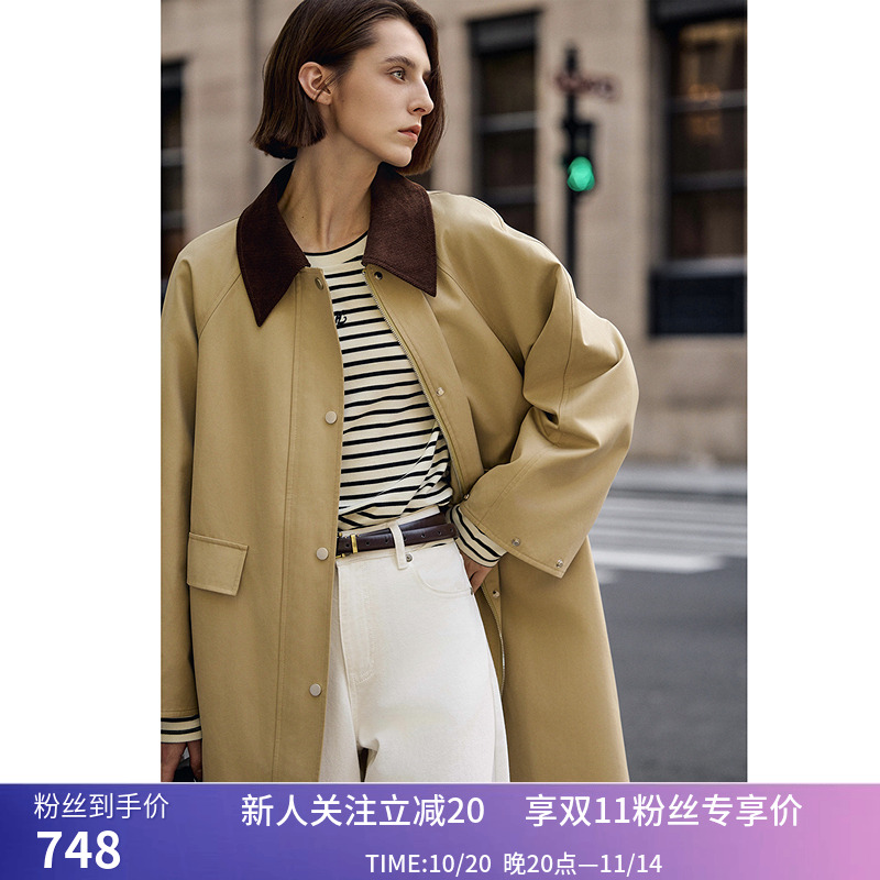 LILY秋新款女装复古条绒撞色翻领廓形百搭通勤风衣外套中长款
