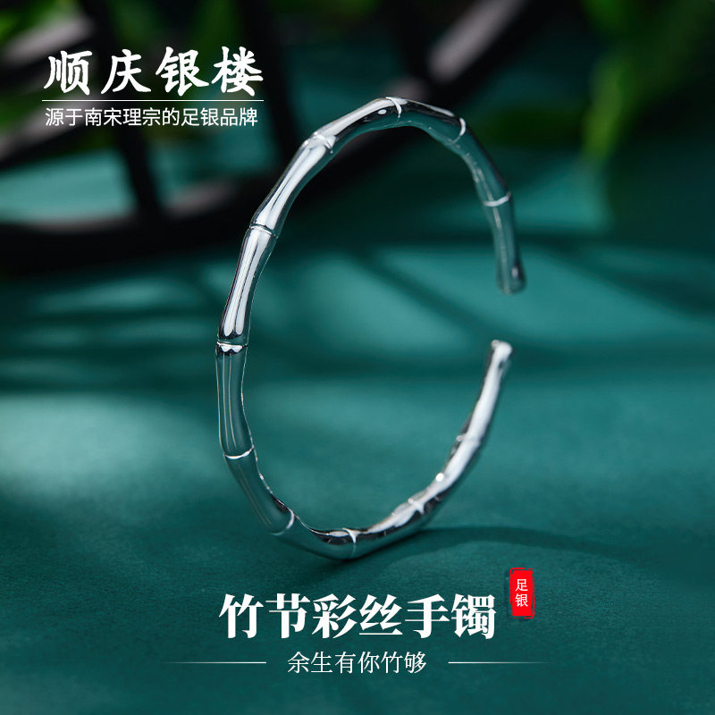 顺庆银楼足银9999竹节彩丝手镯新中式简约精致纯银手镯送女友礼物