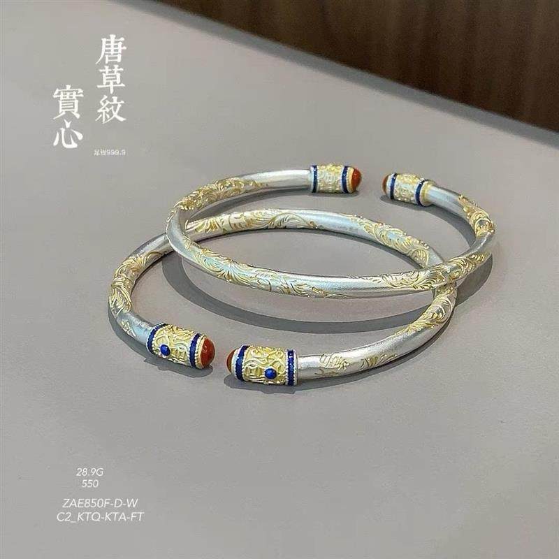 卷草纹纯银9999手镯中式国风足银吉言描金手镯实心唐草纹送女友礼