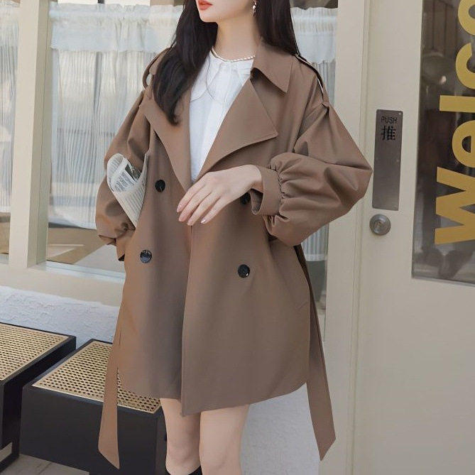 咖色短款风衣外套女宽松2025秋冬装新款韩版ins小个子灯笼袖大衣