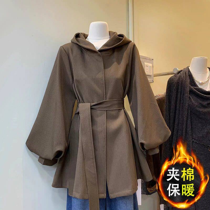 夹棉韩版连帽系带收腰中长风衣女秋季高级感超好看灯笼袖大衣外套