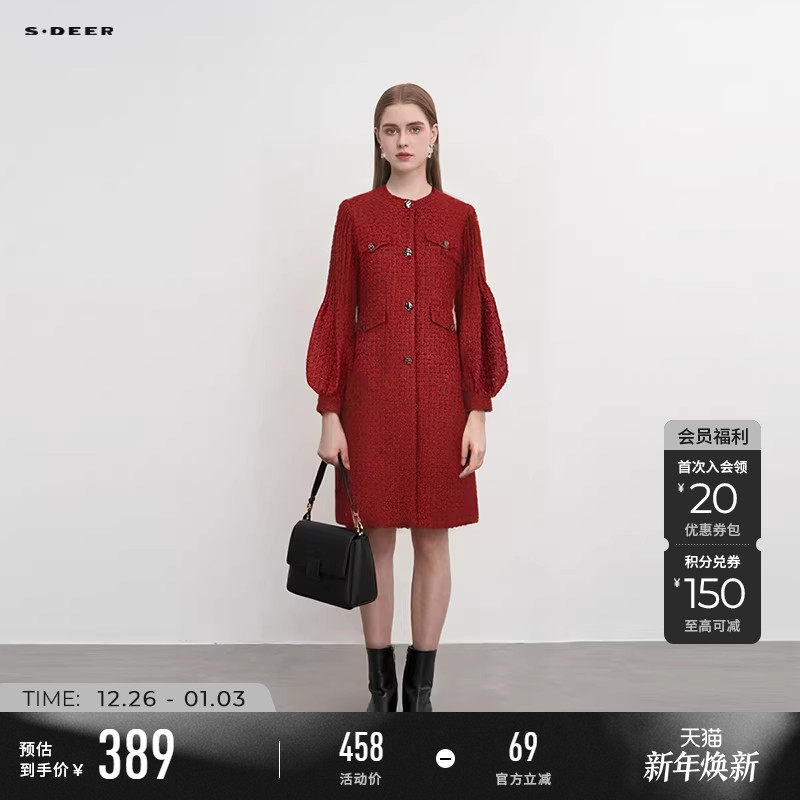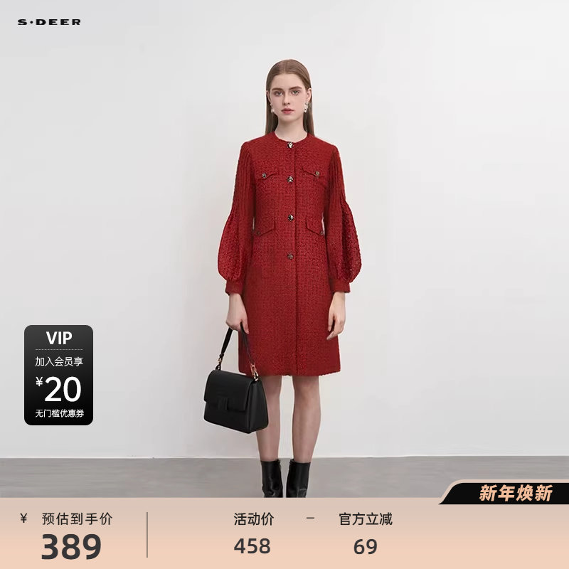 【新年款】sdeer圣迪奥圆领格纹压褶灯笼袖大衣式羽绒服S234Z2481