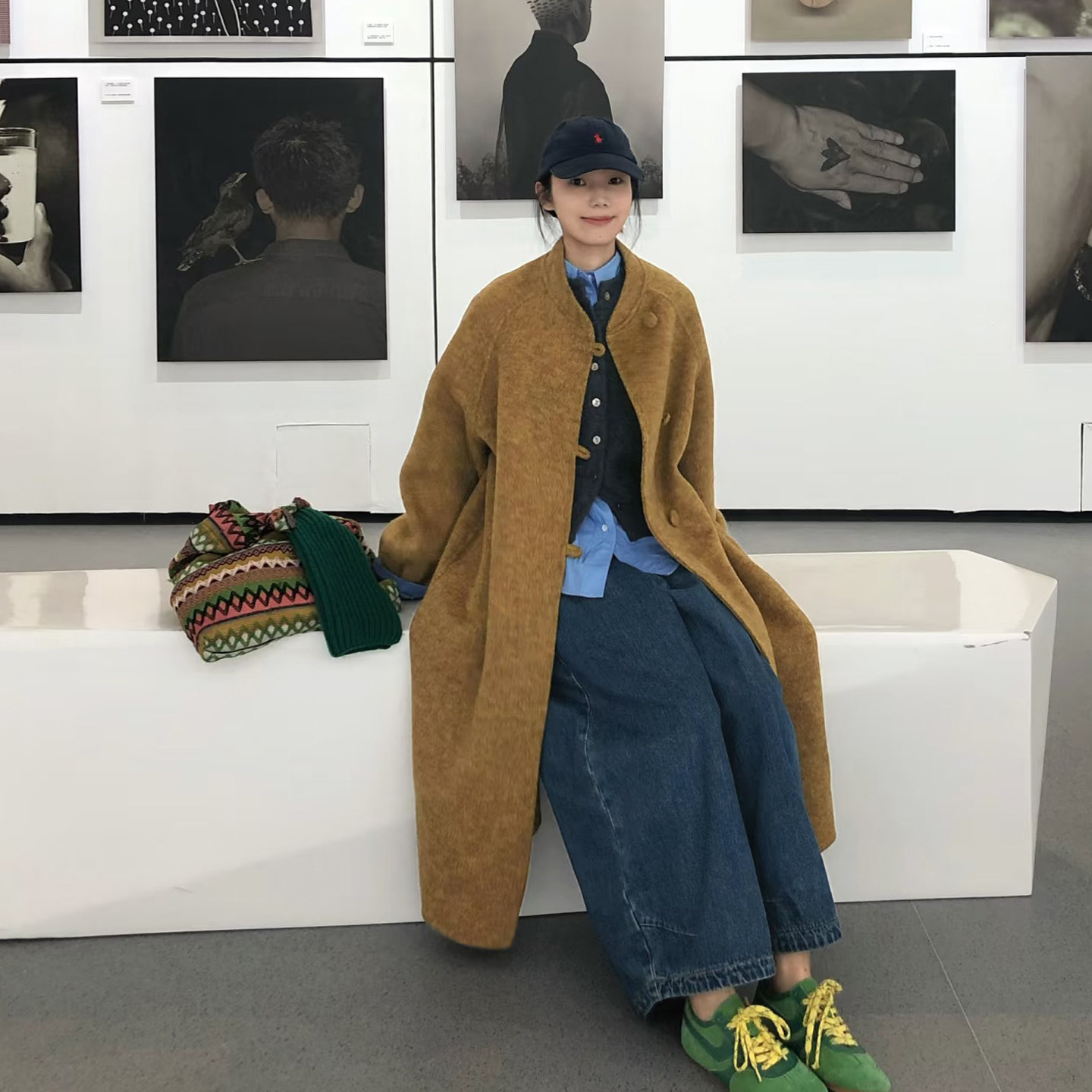 复古秋叶黄立领宽松毛呢外套女秋冬季小个子灯笼袖中长款呢子大衣