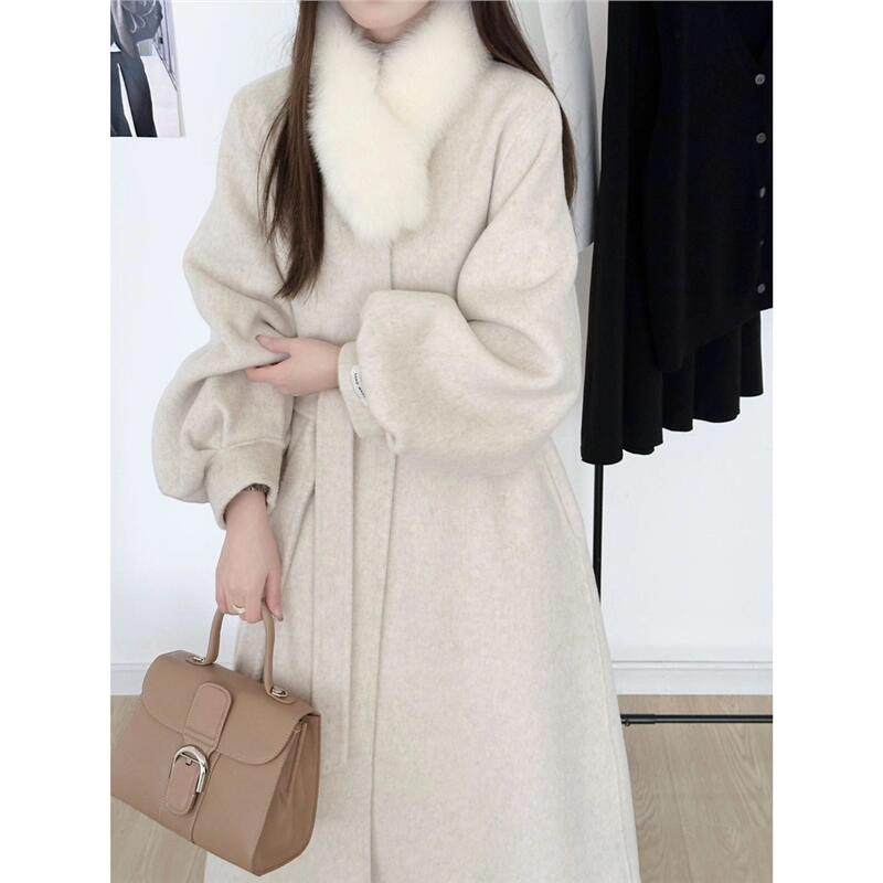 2025新款毛呢大衣女中长款灯笼袖收腰系带毛领外套女装长袖毛呢外