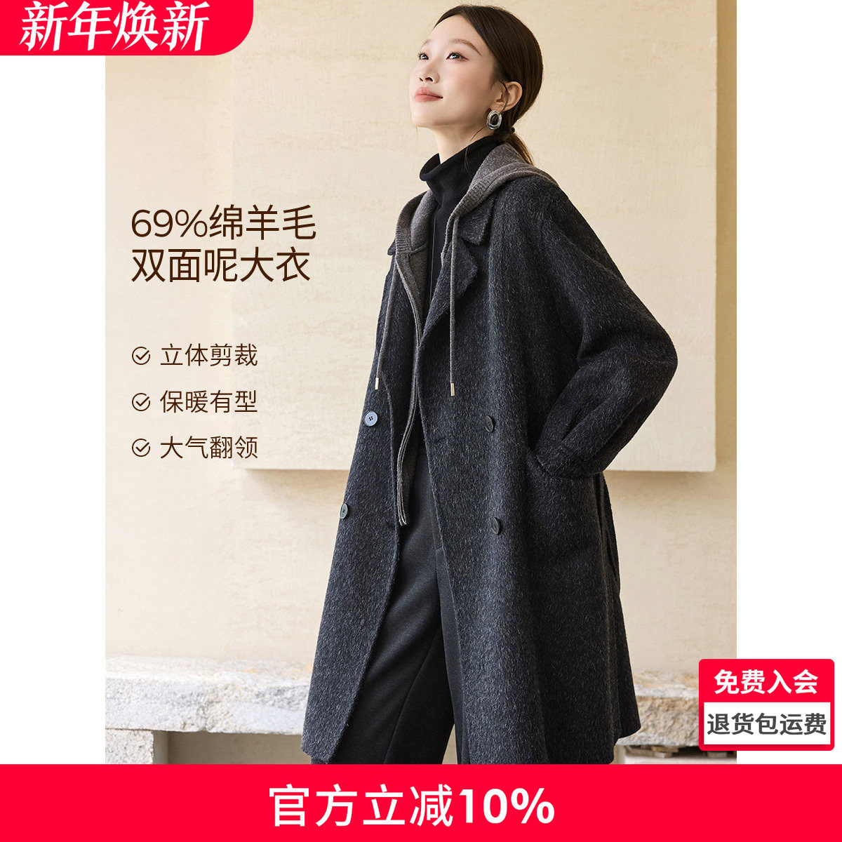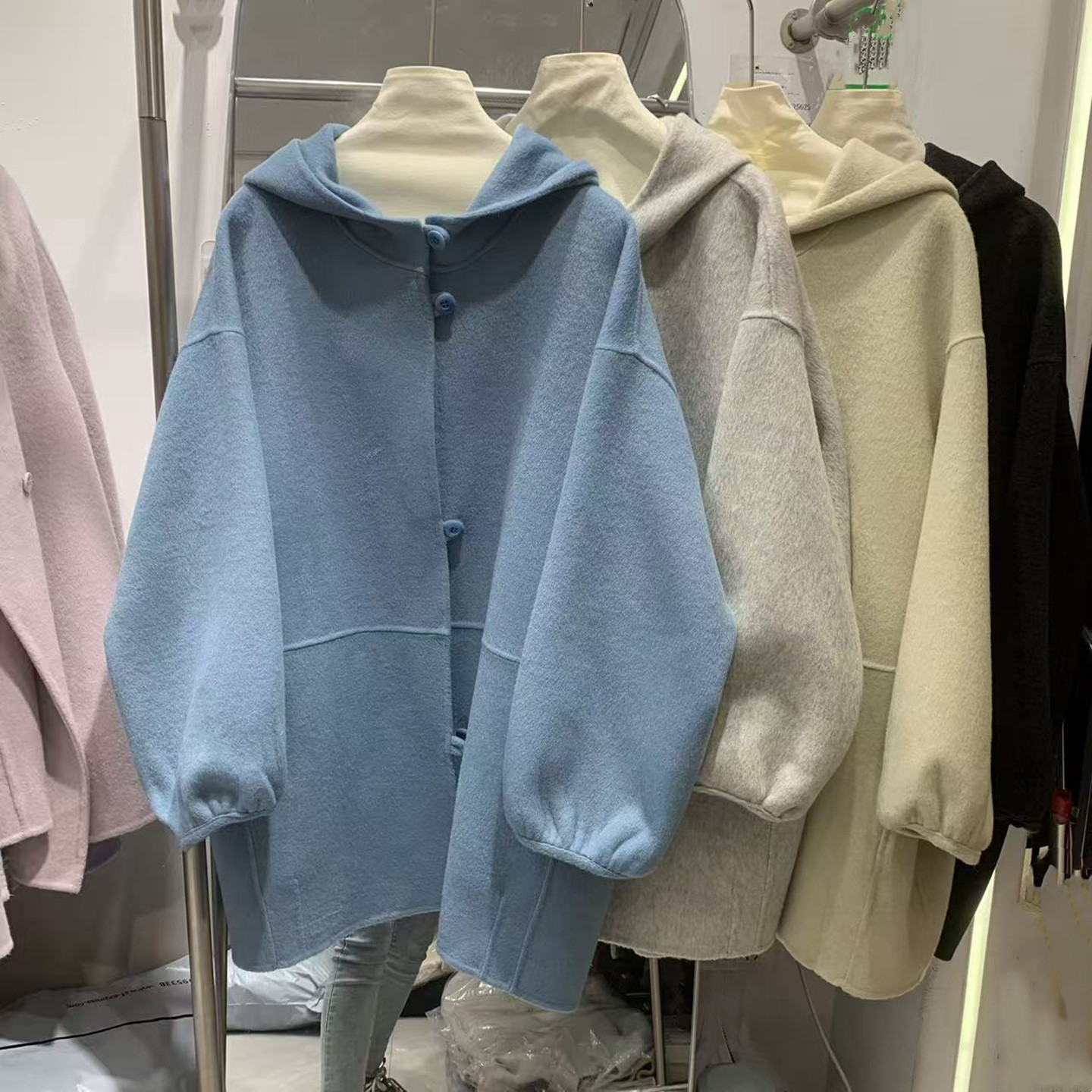 连帽灯笼袖中长款羊毛双面呢大衣女2025秋冬新款宽松慵懒毛呢外套