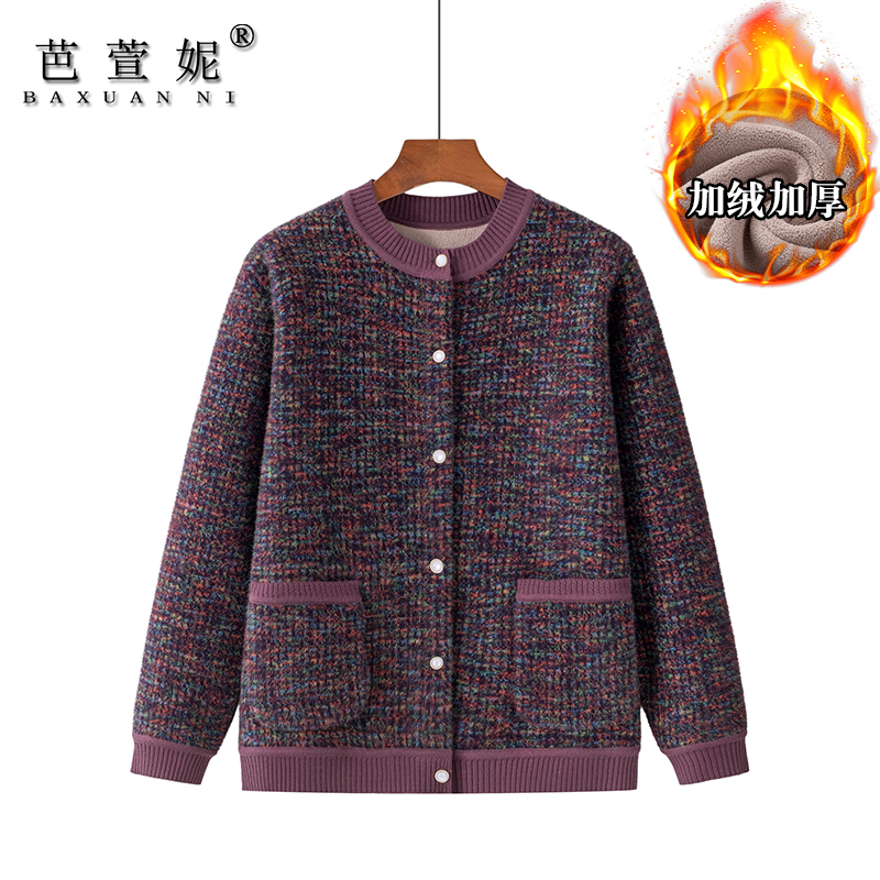 60奶奶加绒保暖针织衫老年人毛衣女一体绒开衫老太太加肥加大外套