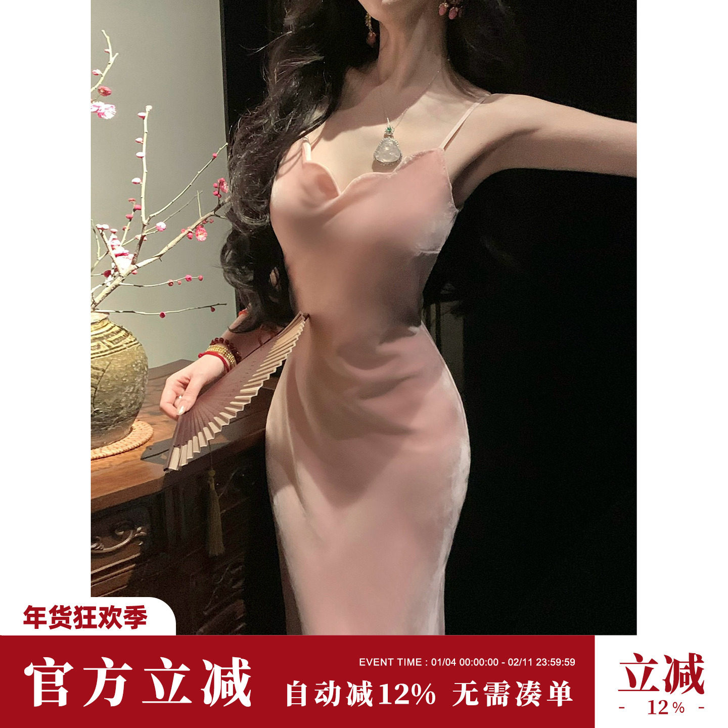 ooh itch痒痒 新中式性感风紫色丝绒吊带连衣裙V领修身长裙