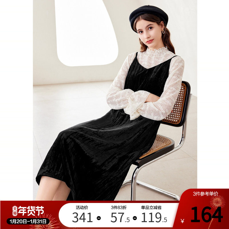 betu百图女装2025年冬季新款宽松优雅气质中长款丝绒吊带连衣裙