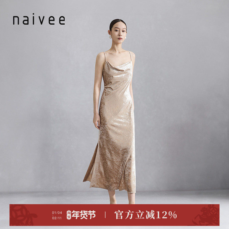 naivee纳薇秋款优雅气质贵气荡领收腰显瘦丝绒吊带连衣裙女