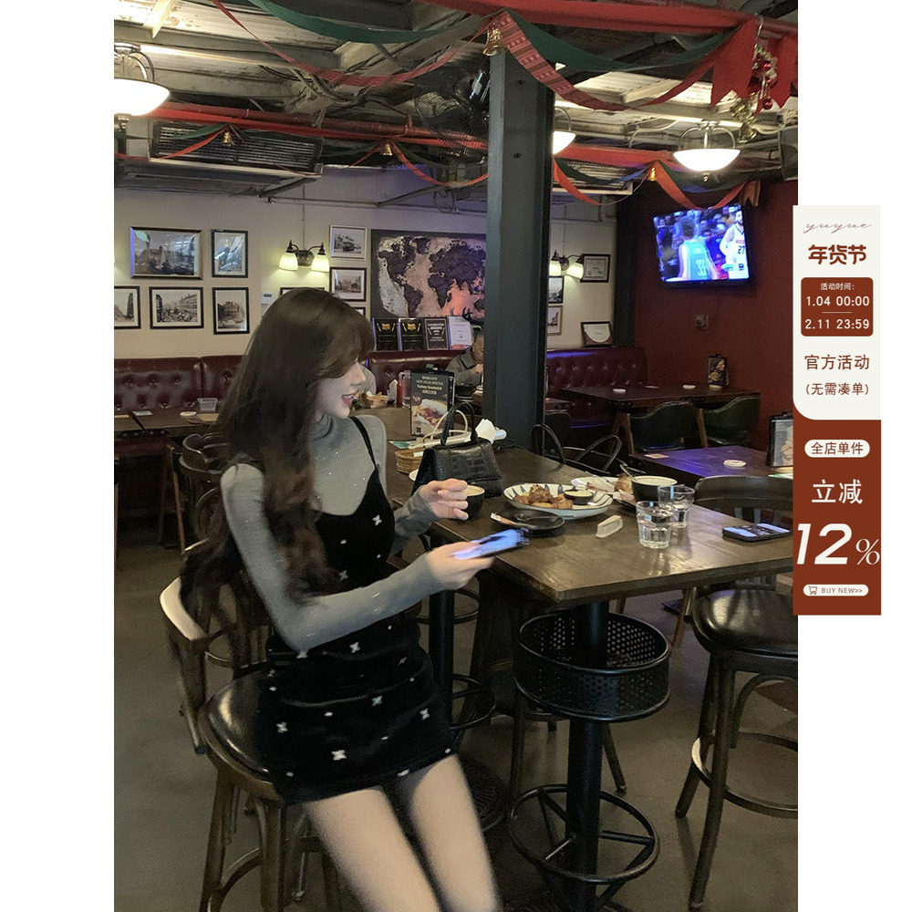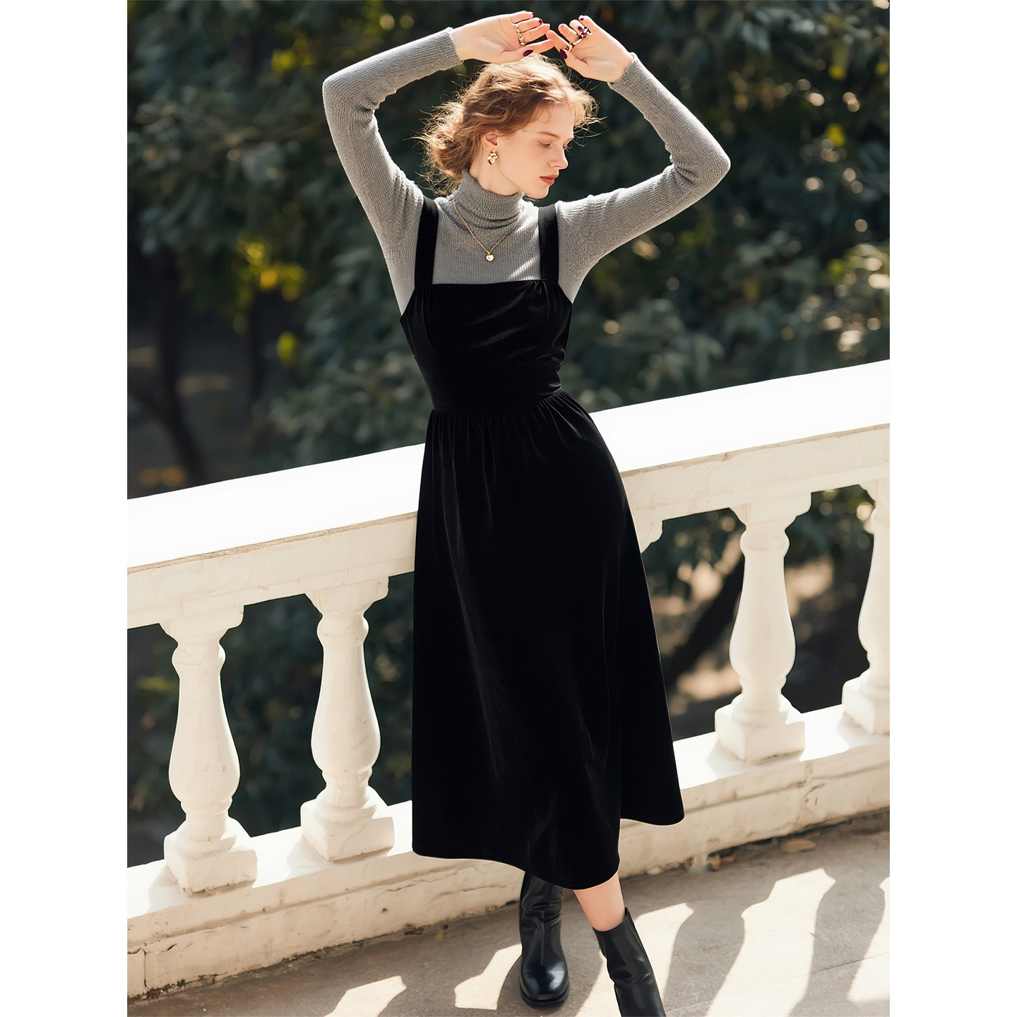 法式黑色丝绒吊带连衣裙女秋冬新款背带裙子2026超火穿搭一整套