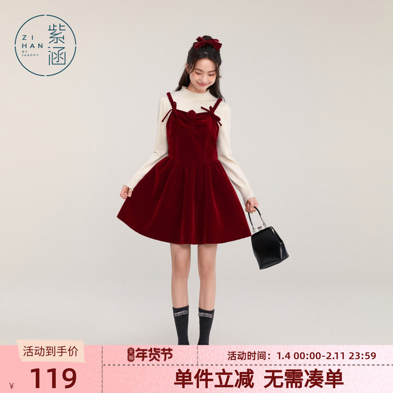 Palglg法式小香风红色丝绒吊带连衣裙女冬季圣诞蓬蓬蛋糕小礼裙子