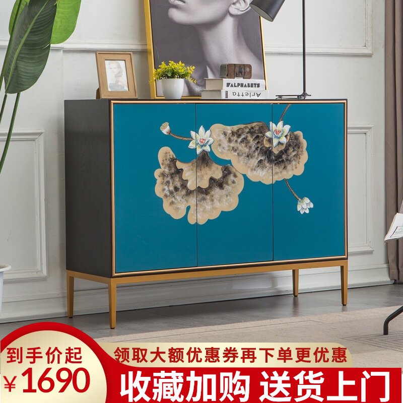 美式实木鞋柜家用门口玄关一体进门入户鞋柜边柜手工荷花彩绘整装