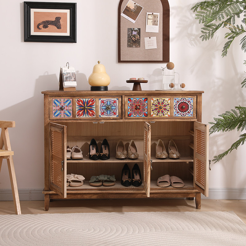 美式实木鞋柜藤编储物柜子客厅靠墙收纳鞋柜门口柜放鞋柜子玄关柜