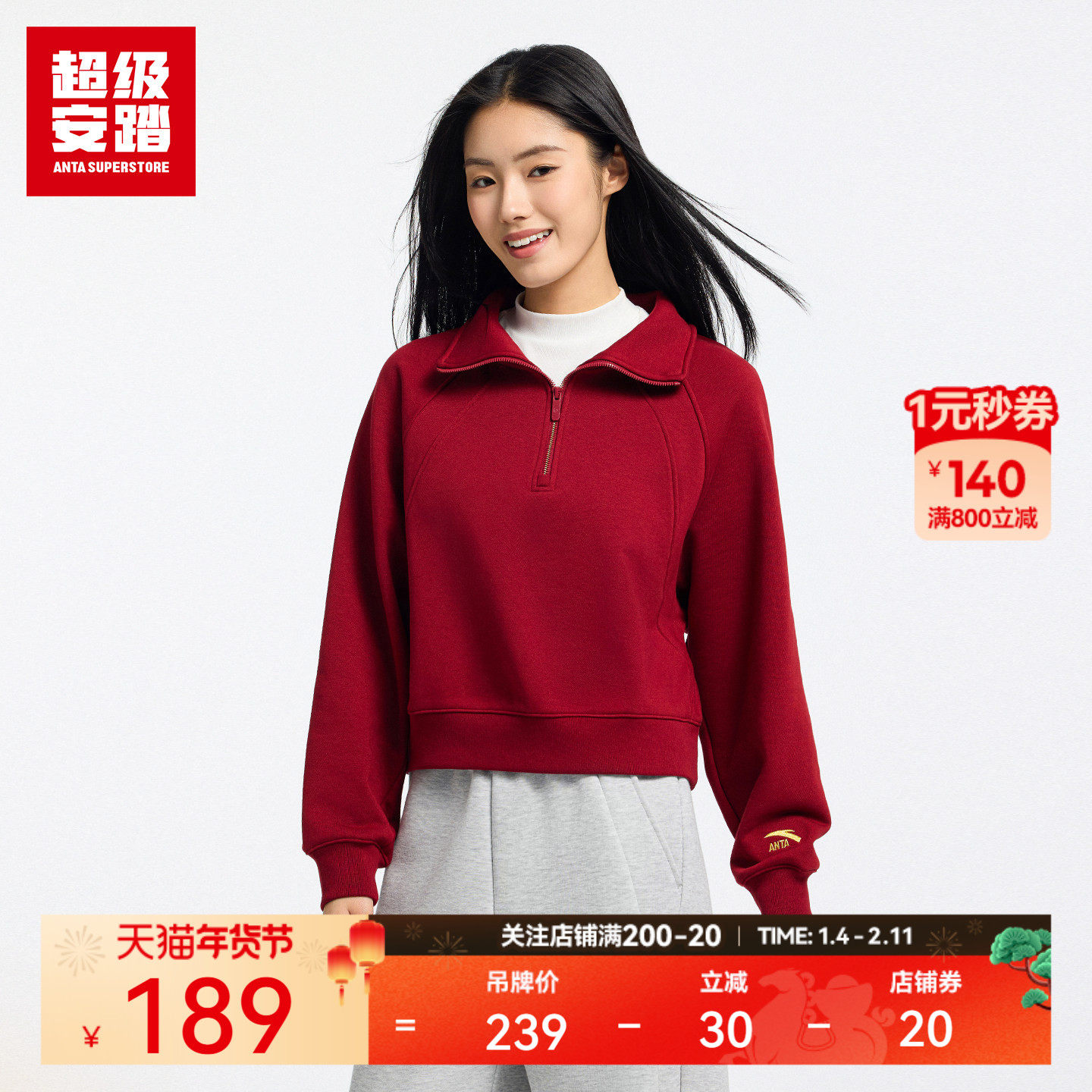 超级安踏SOFT卫衣 | 女子半拉链翻领套头衫休闲长袖162618717U