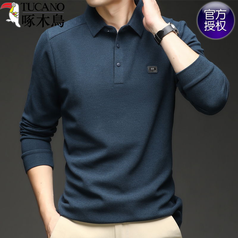 啄木鸟男士长袖t恤春秋装100%纯棉翻领内搭秋衣中年打底polo衫男