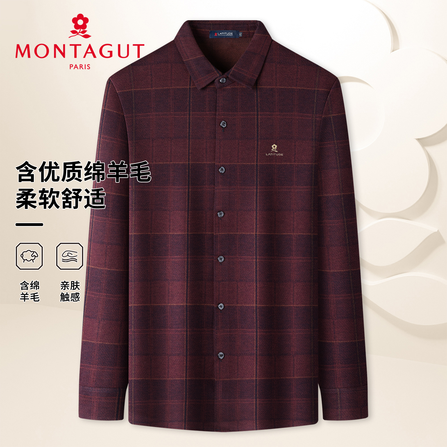 梦特娇男绵羊毛衬衫2025秋冬新款中年长袖宽松上衣商务格子衬衣Z