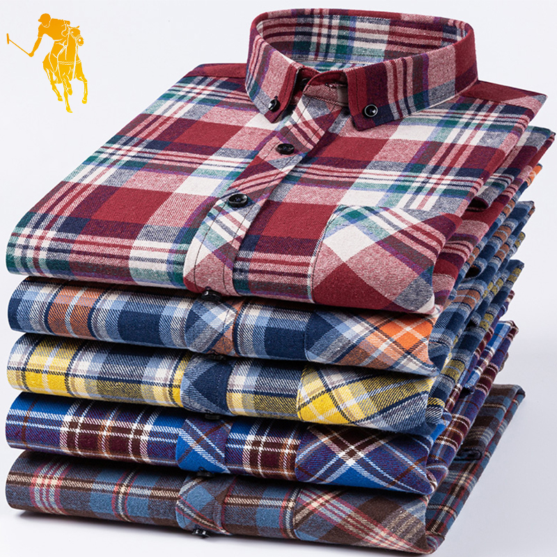 保罗100%纯棉男士磨毛长袖衬衫中年休闲春秋款全棉格子衬衣爸爸装