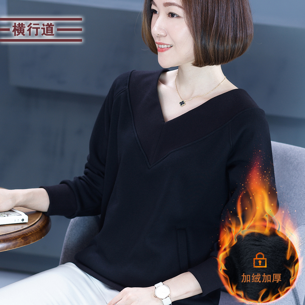 2025冬装大码女装v领休闲宽松简约中年长袖卫衣纯色加绒上衣外穿