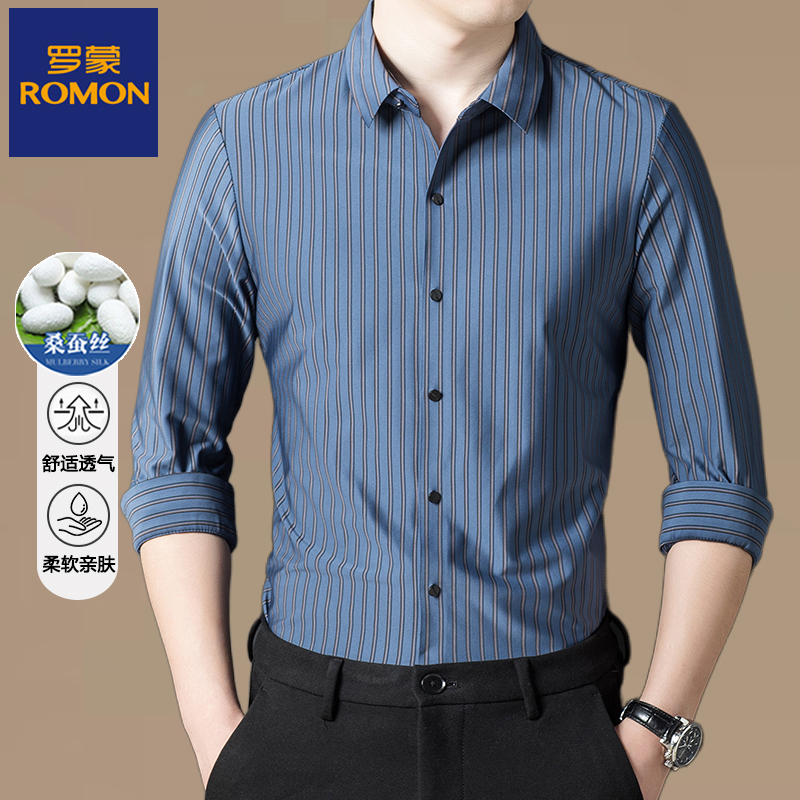 罗蒙男装春秋款桑蚕丝中年男士中年长袖衬衫休闲上衣无痕免烫衬衣